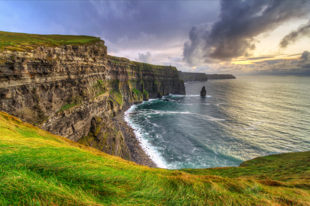 As Cliffs of Moher são uma das atrações naturais mais impressionantes da Irlanda. Localizadas na costa oeste, essas falésias se erguem dramaticamente sobre o Oceano Atlântico, oferecendo vistas espetaculares que se estendem por quilômetros. É o lugar perfeito para uma caminhada relaxante, onde você pode apreciar a beleza selvagem do litoral irlandês. Nos dias claros, é possível avistar as Ilhas Aran ao longe, completando a vista panorâmica.